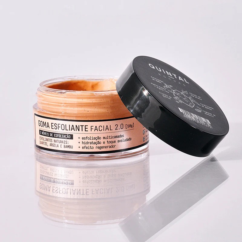 Regenera e restaura: indicada para todos os tipos de pele, a Goma Esfoliante Facial possui partículas naturais que promovem uma esfoliação multicamadas, ativos cicatrizantes e um prebiótico que restaura a microbiota e forma um filme protetor, deixando a pele mais macia e saudável.