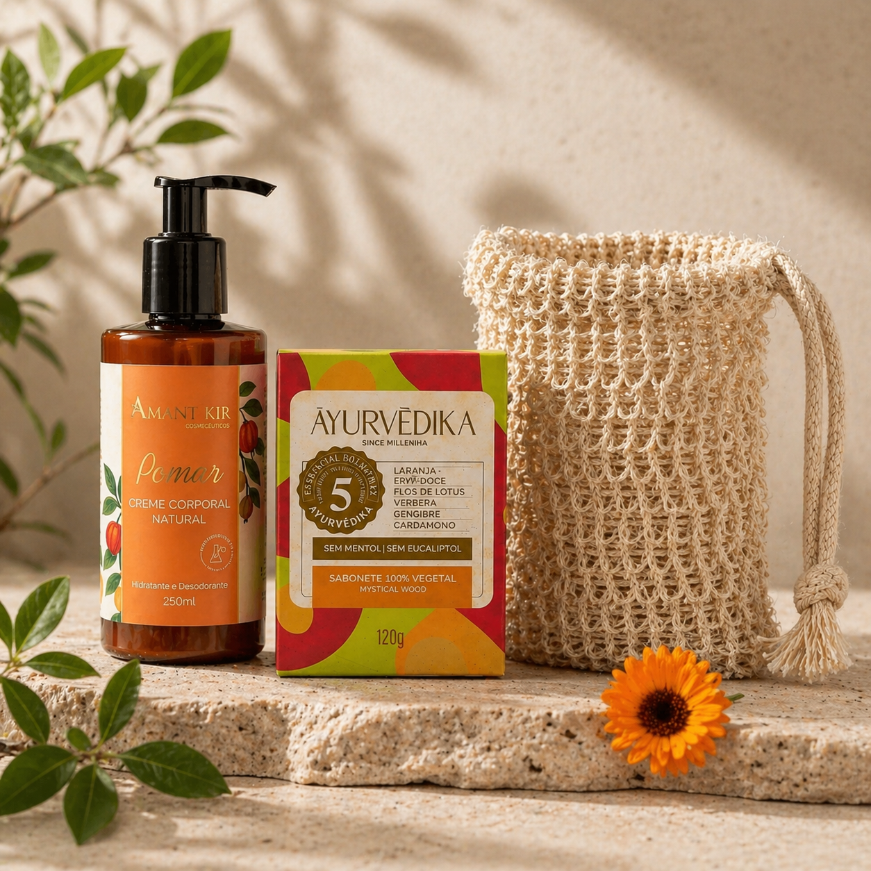 O Kit Pomar reúne três etapas essenciais de autocuidado: limpeza, estímulo da pele e hidratação profunda — criando uma rotina simples, natural e eficaz para relaxar o corpo e restaurar a pele.