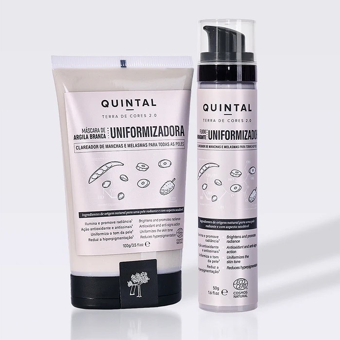 Contém a dupla: Máscara Facial de Argila Branca Uniformizadora e o Fluido Hidratante Finalizador Uniformizador que possuem efeito clareador, promovem a hidratação com efeito antioxidante, reduz a hiperpigmentação e estimula a síntese de colágeno, entregando aspecto saudável e revitalizado, com viço e brilho radiante.